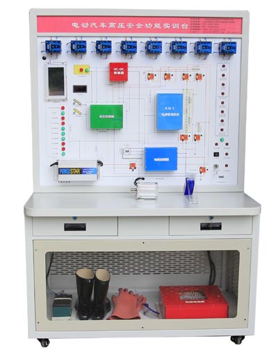 5.實訓(xùn)臺上部為系統(tǒng)電路原理圖和各系統(tǒng)的實物,實訓(xùn)桌下部安裝有低壓電源和高壓電池組,可通過透明窗口觀察鋰電池組。左側(cè)、右側(cè)后側(cè)網(wǎng)孔板通風散熱。