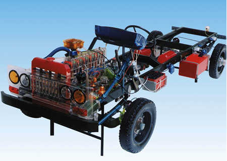 本品選用透明有機玻璃制作,內(nèi)中部件均以硬質(zhì)塑料料加工,用 螺絲固定在金屬高溫烘漆而成的車架上。各總成部分都以壓模成形加 工,代替過去膠粘合的方法,使產(chǎn)品在強度上有很大提高。發(fā)動機總成用電機驅(qū)動,在油門處設有調(diào)速裝置,能演示發(fā)動機轉速高低。離合器分離明顯,操縱靈活,離合器外殼整體壓模而成,變速箱和各檔齒輪用各種顏色表示,換檔靈活,手制動美觀。后橋外形壓模而成,內(nèi)中主減速、差速轉動自如,輪轂剎蹄壓模成型,剎蹄可調(diào)節(jié),前橋輪鼓可調(diào)整,轉向裝置以及電瓶、油箱、水箱,制動管路分布清楚一目了然。電路采用對插件前后分布,燈架、風窗、儀表板、后燈架用透明有機玻璃壓模成整體美觀逼真。