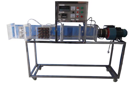 多翼式低噪音風機,自動調節(jié)風門,組合式有機玻璃風洞,翅片加熱管,加熱由固體調壓模塊配電位器調節(jié)加熱功率,數顯電流表、電壓表,翅片管簇順排和叉排組合,溫度傳感器,畢托管配差壓傳感器測量風量,16路萬能信號輸入巡檢儀顯示溫度、阻力、流量,不銹鋼支架。